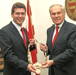 es für mich eine große Ehre aus deinen Händen diese Bürgermeisterkette zu übernehmen. Du bist für mich ein Mann ohne dessen visionäre Kraft viele Projekte nie initiiert und viele bleibende Akzente nie gesetzt worden wären. Ich beschreite heute einen Weg, der von dir und von deinem Vorgänger Edwin Pircher, der sehr zu meiner Freude ebenfalls anwesend ist, geebnet wurde. Mit euch ist die Geschichte Tullns unmittelbar verbunden und ich sehe es als große Auszeichnung euer Nachfolger zu sein. Zu eurer Arbeit fallen mir zu nennende Attribute ein, wie: Innovation, Umsetzung und Fortschritt! An dieser Stelle ein großes Danke an euch!