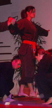 Ja, die junge Dame links steht auf einem scharfen Schwert und dennoch verletzt sie sich nicht. Das ist nur eine kleine Kostprobe aus den Vorführungen des Yamabushi Dojo Langenlebarn, der es sich zum zweiten Mal zur Aufgabe gestellt hatte, gemeinsam mit anderen Kampfkunstvereinen sein Können positiv einzusetzen um Geld für karitative Zwecke zu sammeln.
