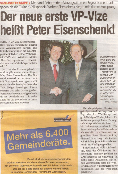 Im März 2005 versendete ich die Einladung an die Wählerinnen und Wähler in der Stadtgemeinde Tulln am Vizebürgermeisterrennen der ÖVP teilzunehmen. Das erfreuiche Ergebnis sicherte mir die Position vor allem aber die Funktion des 1. Vizebürgermeisters.