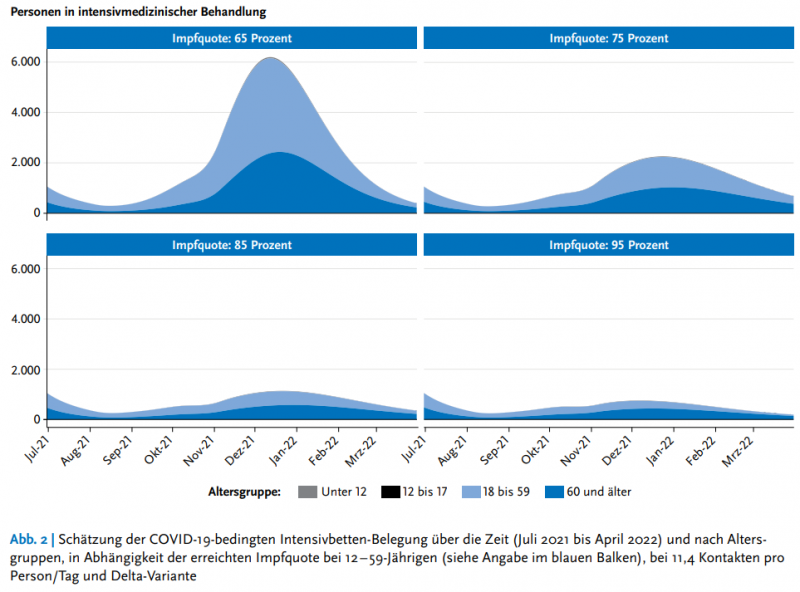 Auch das Robert Koch Institut sieht die Situation am 8. Juli 2021 sehr kritisch und publizierte, dass aufgrund der Delta-Variante „die Impfkampagne mit hoher Intensität weiter geführt werden sollte, bis mindestens 85% der 12- bis 59-Jährigen bzw. 90 % der über 60-Jährigen vollständig gegen COVID-19 geimpft sind. Die Delta-Variante wird sich auf die ITS-Belegung vor allem dann auswirken, wenn die Impfquoten bei den 12- bis 59-Jährigen bei 75 % oder gar 65 % stagnieren und gleichzeitig eine komplette Öffnung stattfindet“.