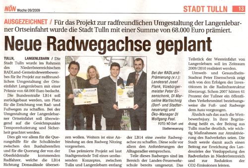 Seit vielen Jahren investiert die Stadtgemeinde Tulln sehr viel Geld in den Ausbau des Radwegenetzes. Unser nächstes Projekt ist eine Radwegeverbindung entlang der LB 14 zwischen Tulln und Langenlebarn. Als erster Schritt soll der Ortsbeginn von Langenlebarn an den Radweg Nitzing angebunden werden. Der Kommentar dazu vom Land NÖ im Zuge des Wettbewerbs RADLand NÖ: "Der Beitrag aus Tulln macht deutlich, wie wichtig Maßnahmen zur Attraktivierung des Radverkehrs sind. Tulln wird damit auch einen wichtigen Beitrag zur Erreichung des Landeszieles der Verdopplung des Radverkehrs in Niederösterreich und damit verbunden der Reduktion der CO2-Emissionen leisten." Wir bedanken uns sehr herzlich für die Förderung in Höhe von € 68.000,--.