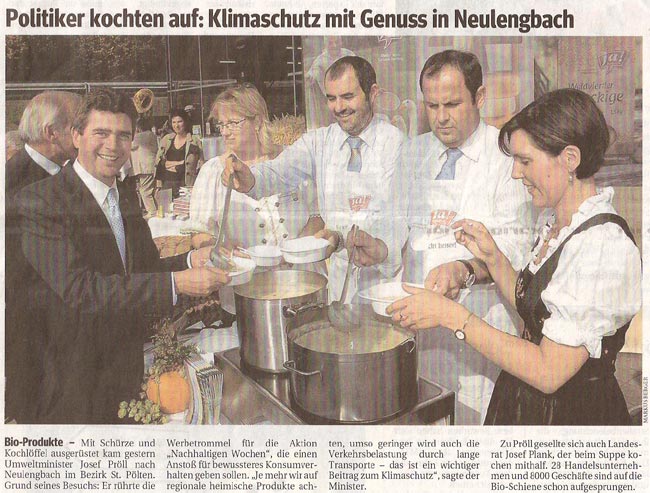 Umweltminister Josef Pröll rührte die Werbetrommel für die Aktion "Nachhaltigen Wochen", die einen Anstoß für bewussteres Konsumverhalten geben soll. Ziel: Es ist wichtig auf regionale heimische Produkte zu achten, denn umso geringer ist die Verkehrsbelastung durch lange Transporte. Insgesamt unterstützen bereits 28 Handelsunternehmen und 8000 Geschäfte diese Bio-Schiene.