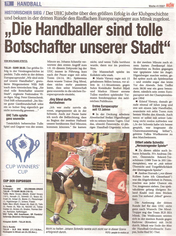 Unsere Handballer gewannen gegen den Schweizer Vertreter TV Suhr im Bundesschulzentrum 38:30 (19:13). Schon das Hinspiel in der Schweiz hatten die Tullner, für die Kristof Vizvary mit zehn Treffern erfolgreichster Werfer war, mit 33:30 für sich entschieden.