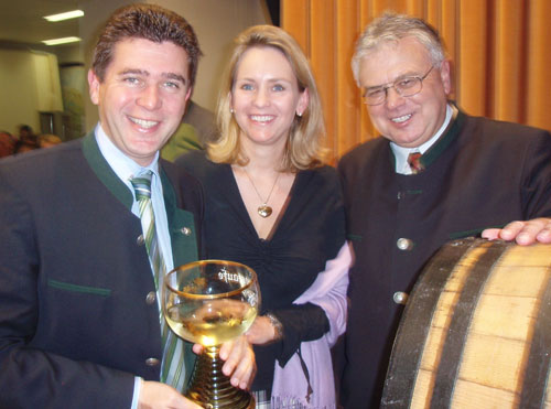 Die Weintaufe in Tulbing (im Bild meine Gattin sowie Bgm. Edi Eckerl) hat Tradition und stützt die Geselligkeit und Gemeinschaft. Originell der Name des Jungweins: Trotzpinkel.